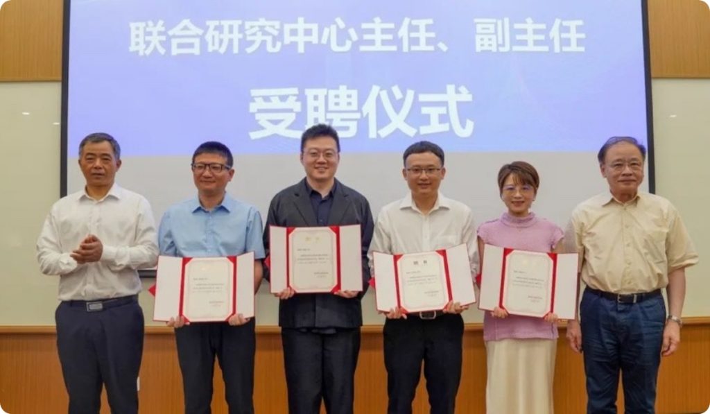 中国科学院院士馬余剛(一番左)、褚君浩(一番左)が、連合研究センターの責任者に職状の認定書を授与しました。